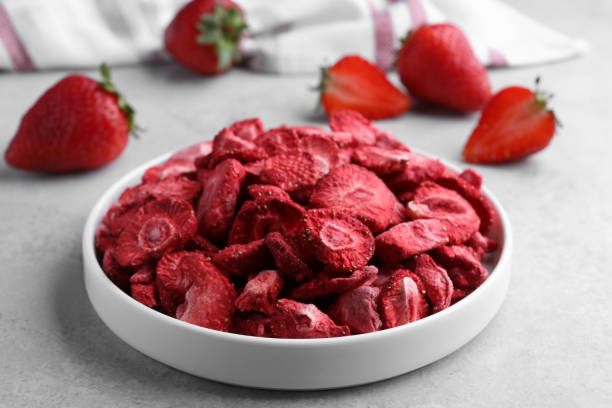 These freeze-dried strawberries can serve as healthy ready-to-eat snacks or be used in cereals, granola, eaten with yogurt, incorporated into smoothies, in desserts, baking, and gourmet dishes. They also have a long shelf life and require no refrigeration, meaning that they can offer the flavor and nutrients of fresh strawberries packaged for convenience, shelf-stable individual consumption, or bulk food use.